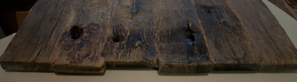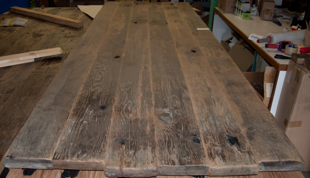 Een prachtig tafelblad van lange geborstelde oude eiken wagonplanken. De uiteinden van de tafel zijn niet recht afgezaagd. De oorspronkelijke uiteinden van de wagonplanken zijn nog zichtbaar en hierdoor zijn de uiteinden van de tafel ook grof gevormd en ongelijk van lengte.