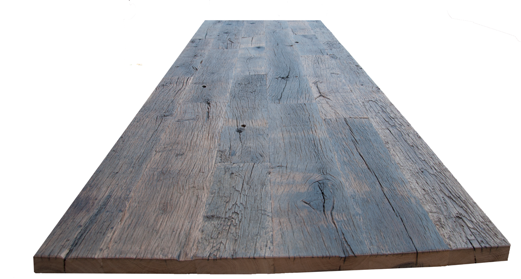 Een uniek tafelblad met een geweldige uitstraling. Dit tafelblad is gemaakt van eiken wagonplanken. De meeste wagons hebben een vloer van 270cm breed. De planken liggen in de breedte van een wagon en hebben een lengte van 270cm. Vaak zijn de uiteinden van zo’n wagonplank versleten en moeten de meubelmakers de planken inkorten. Zo blijven er korte stukken over. Hiermee wordt een compositie van plankdelen gemaakt. Als de meubelmakers tevreden zijn over de compositie, dan worden de delen definitief aan elkaar gelijmd tot een tafelblad. Zo’n blad wordt een verlengd blad genoemd, de korte plankdelen zijn verlengd tot lange planken. Met deze techniek is bijna iedere denkbare lengte te maken.